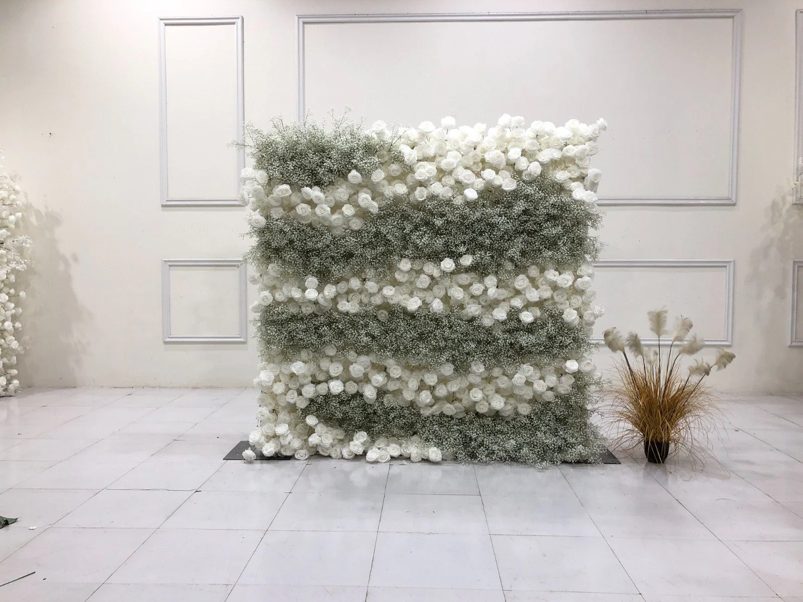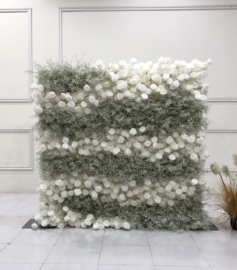 Classic & Timeless! Our Essence Flower Wall is an ombre design filled with white roses and baby breath florals.