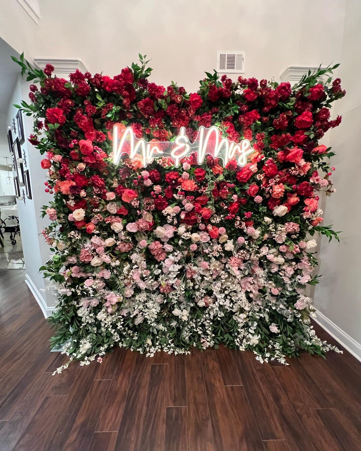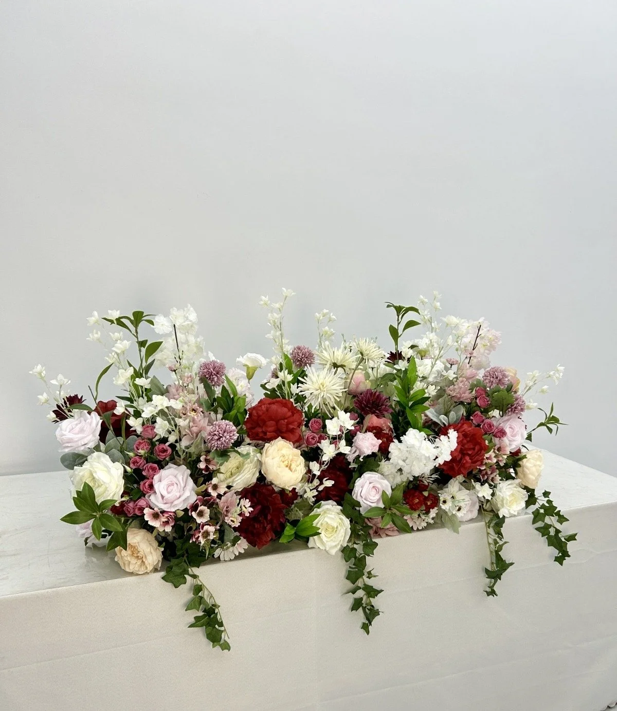 Whimsical Gardens is a light, garden-inspired floral table runner designed for sweetheart tables, featuring soft silk florals and organic movement throughout. It brings a romantic, effortless feel to your reception and pairs beautifully with our coordinating arch, flower wall, aisle runners & centerpieces.